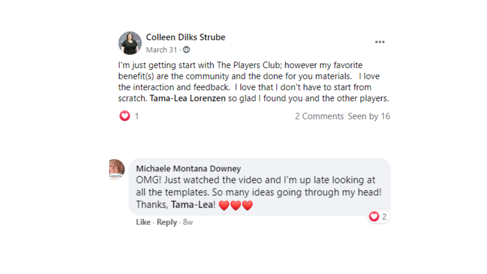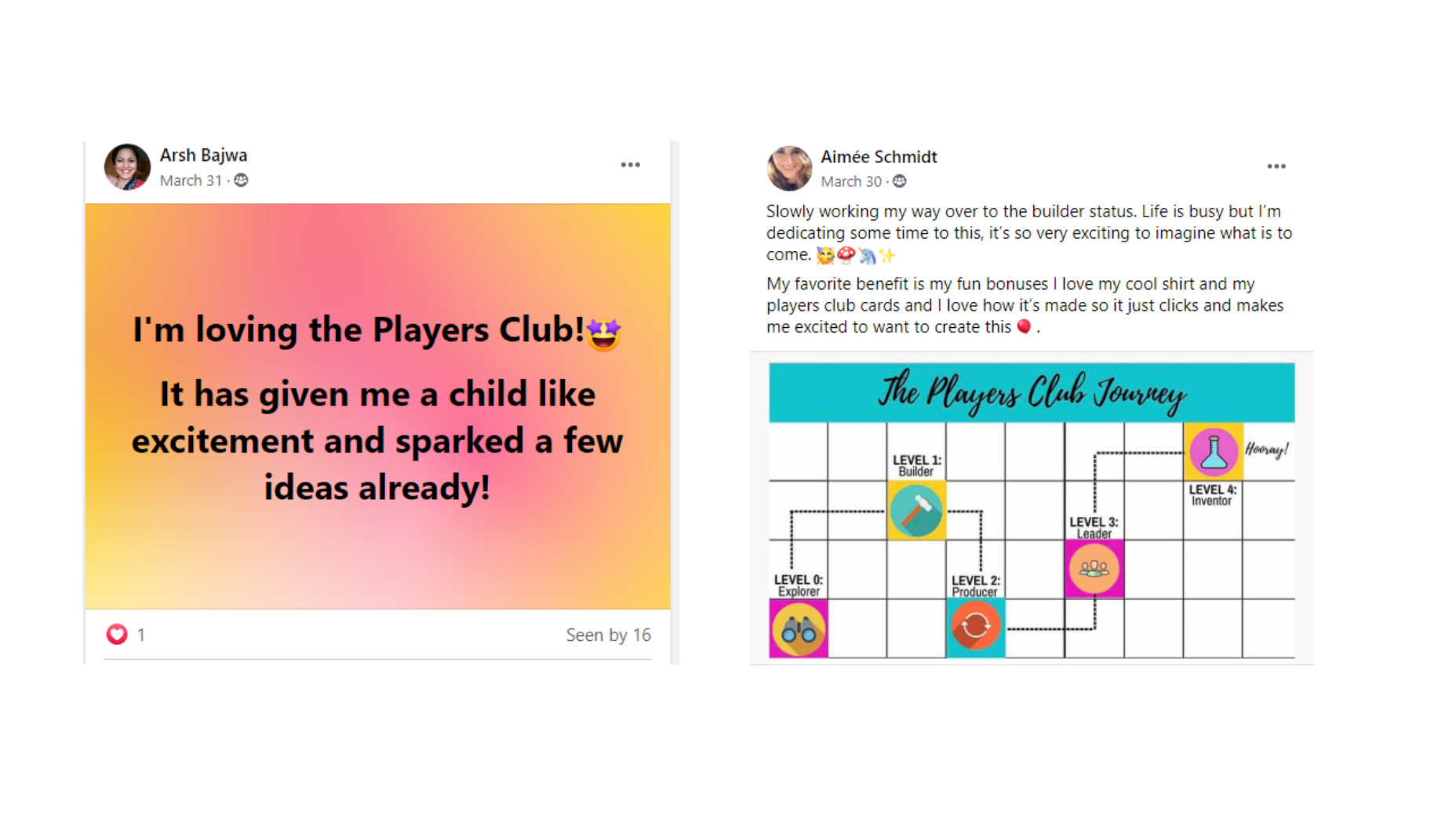 "The Players Club has helped me so much! I love that it teaches in the manner that it preaches, is easy to consume, and offers some great ideas. I love the creative vibe of the group and the community that's developing."